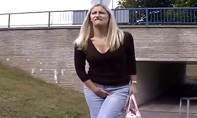 Pale busty blondie pisses and then sucks a dick on the sea bank